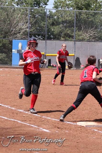 A Great Bend Lady Panther runs to First during the Liberal Lady Redskins at Great Bend Lady Panthers Softball Double Header with Great Bend winning both games 18-0 (3 innings) 13-0 at Barton Community College Softball Field in Great Bend, Kansas on April 27, 2013. (Photo: Joey Bahr, www.joeybahr.com)