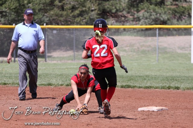 Liberal Lady Redskin Cynthia Cisneros (#5) tries to field the ball as Great Bend Lady Panther McKenna Mauler runs to Second during the Liberal Lady Redskins at Great Bend Lady Panthers Softball Double Header with Great Bend winning both games 18-0 (3 innings) 13-0 at Barton Community College Softball Field in Great Bend, Kansas on April 27, 2013. (Photo: Joey Bahr, www.joeybahr.com)