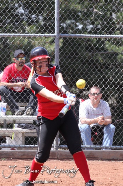 A Great Bend Lady Panther hits the ball during the Liberal Lady Redskins at Great Bend Lady Panthers Softball Double Header with Great Bend winning both games 18-0 (3 innings) 13-0 at Barton Community College Softball Field in Great Bend, Kansas on April 27, 2013. (Photo: Joey Bahr, www.joeybahr.com)