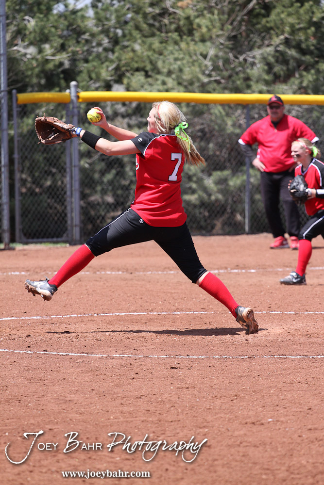 Great Bend Lady Panther Braylin Bretz winds up to deliver a pitch during the Liberal Lady Redskins at Great Bend Lady Panthers Softball Double Header with Great Bend winning both games 18-0 (3 innings) 13-0 at Barton Community College Softball Field in Great Bend, Kansas on April 27, 2013. (Photo: Joey Bahr, www.joeybahr.com)