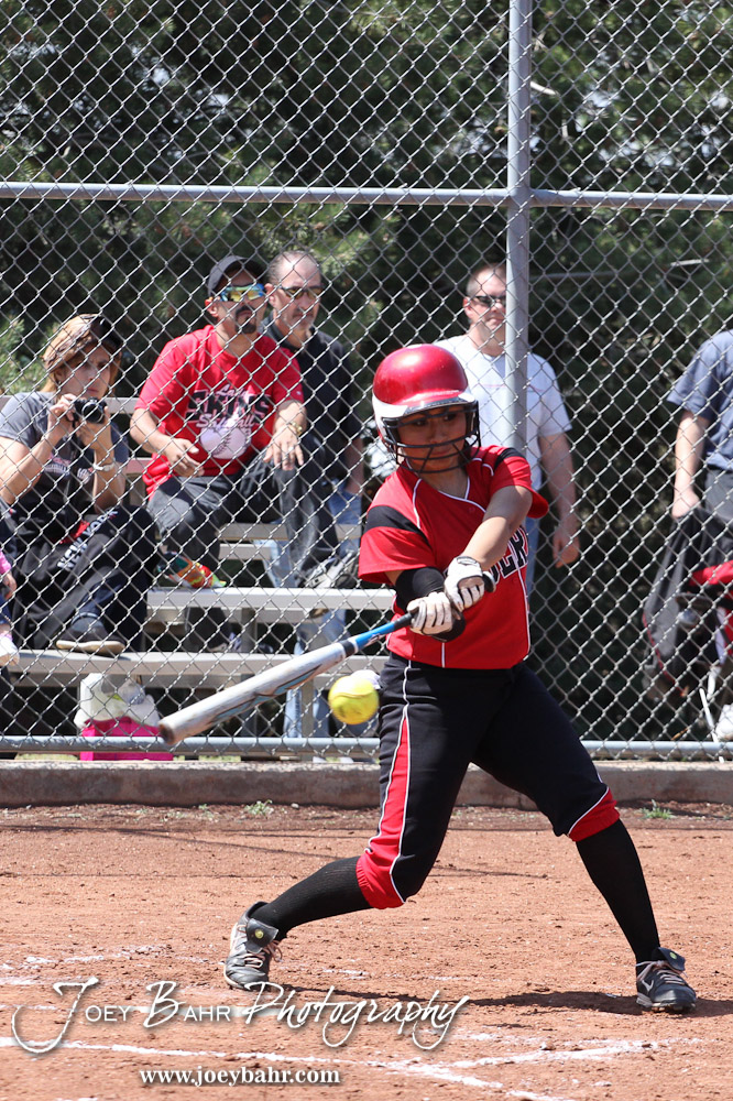 A Liberal Lady Redskin swings at a pitch during the Liberal Lady Redskins at Great Bend Lady Panthers Softball Double Header with Great Bend winning both games 18-0 (3 innings) 13-0 at Barton Community College Softball Field in Great Bend, Kansas on April 27, 2013. (Photo: Joey Bahr, www.joeybahr.com)