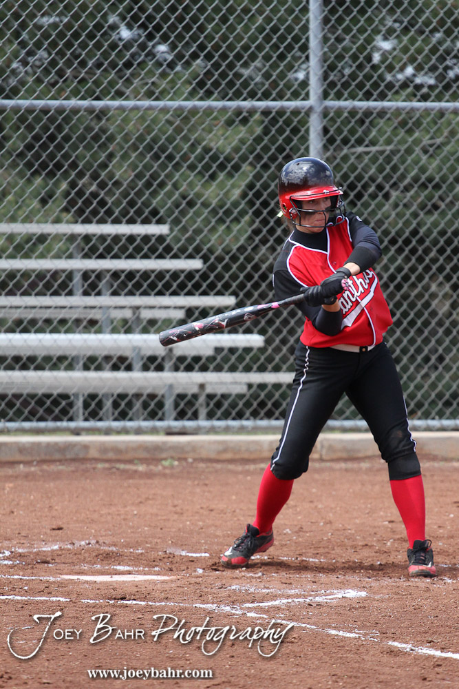 A Great Bend Lady Panther swings at an oncoming pitch during the Liberal Lady Redskins at Great Bend Lady Panthers Softball Double Header with Great Bend winning both games 18-0 (3 innings) 13-0 at Barton Community College Softball Field in Great Bend, Kansas on April 27, 2013. (Photo: Joey Bahr, www.joeybahr.com)