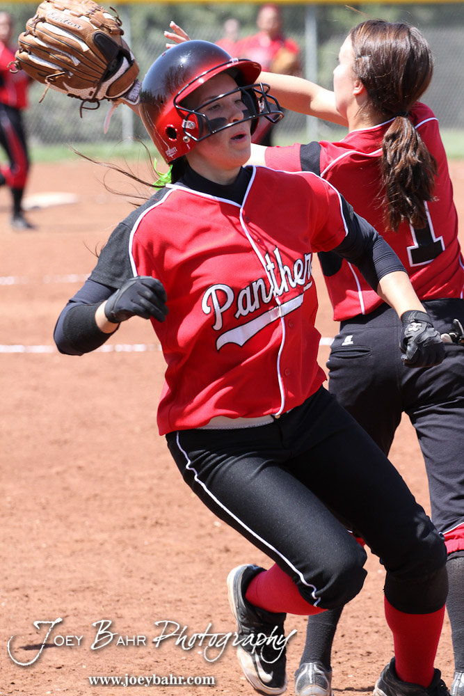 Great Bend Lady Panther Kaylie Doll (#20) tries to beat the throw to first being covered by Liberal Lady Redskin Riley Hay (#1) during the Liberal Lady Redskins at Great Bend Lady Panthers Softball Double Header with Great Bend winning both games 18-0 (3 innings) 13-0 at Barton Community College Softball Field in Great Bend, Kansas on April 27, 2013. (Photo: Joey Bahr, www.joeybahr.com)