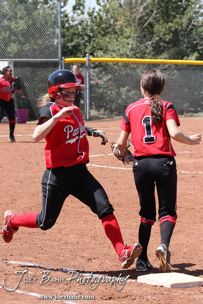 A Great Bend Lady Panther tries to beat a throw to First during the Liberal Lady Redskins at Great Bend Lady Panthers Softball Double Header with Great Bend winning both games 18-0 (3 innings) 13-0 at Barton Community College Softball Field in Great Bend, Kansas on April 27, 2013. (Photo: Joey Bahr, www.joeybahr.com)
