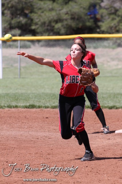 Liberal Lady Redskin Riley Hay (#1) throws a ball to First during the Liberal Lady Redskins at Great Bend Lady Panthers Softball Double Header with Great Bend winning both games 18-0 (3 innings) 13-0 at Barton Community College Softball Field in Great Bend, Kansas on April 27, 2013. (Photo: Joey Bahr, www.joeybahr.com)