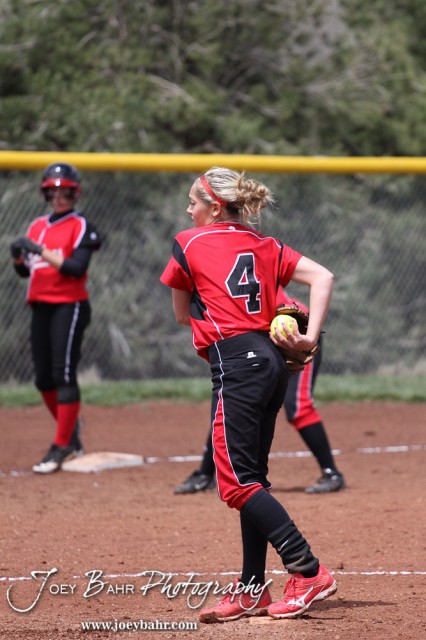 Liberal Lady Redskin Pitcher Brittany Granger (#4) begins her wind up during the Liberal Lady Redskins at Great Bend Lady Panthers Softball Double Header with Great Bend winning both games 18-0 (3 innings) 13-0 at Barton Community College Softball Field in Great Bend, Kansas on April 27, 2013. (Photo: Joey Bahr, www.joeybahr.com)