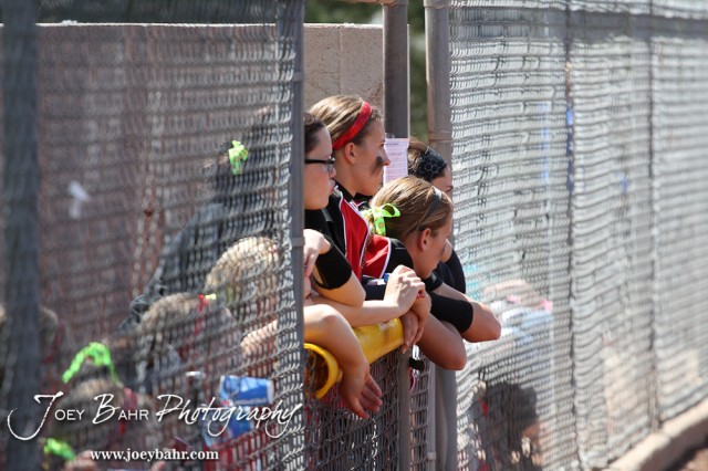 Members of the Great Bend Lady Panthers watch from the dugout during the Liberal Lady Redskins at Great Bend Lady Panthers Softball Double Header with Great Bend winning both games 18-0 (3 innings) 13-0 at Barton Community College Softball Field in Great Bend, Kansas on April 27, 2013. (Photo: Joey Bahr, www.joeybahr.com)