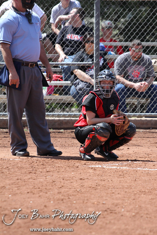 The Great Bend Lady Panther Catcher watches for the pitch signal from the dugout during the Liberal Lady Redskins at Great Bend Lady Panthers Softball Double Header with Great Bend winning both games 18-0 (3 innings) 13-0 at Barton Community College Softball Field in Great Bend, Kansas on April 27, 2013. (Photo: Joey Bahr, www.joeybahr.com)
