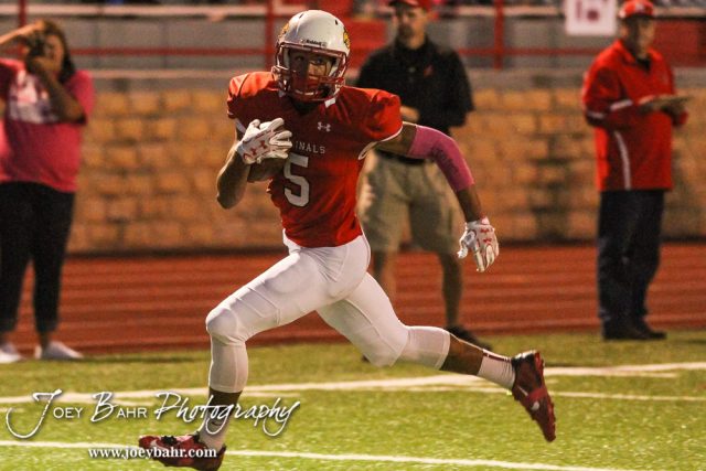 Hoisington Cardinal Cameron Davis (#5) dashes down the field towards the end zone. The Hoisington Cardinals defeated the Lyons Lions to win the KSHSAA Class 3A District 15 Championship at Elton Brown Field in Hoisington, Kansas on October 27, 2016. (Photo: Joey Bahr, www.joeybahr.com)undefined