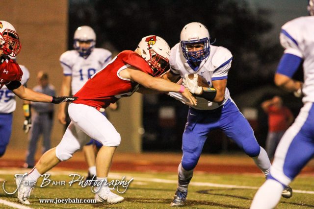 Hoisington Cardinal Hunter Hanzlick (#27) tackles Lyons Lion Terek Smith (#19) for a loss. The Hoisington Cardinals defeated the Lyons Lions to win the KSHSAA Class 3A District 15 Championship at Elton Brown Field in Hoisington, Kansas on October 27, 2016. (Photo: Joey Bahr, www.joeybahr.com)undefined