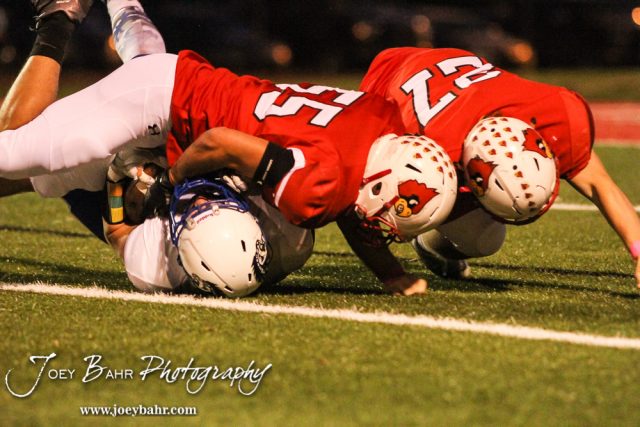 Hoisington Cardinals Grant Dolechek (#55) and Hunter Hanzlick (#27) swallow up a Lyons Lion runner. The Hoisington Cardinals defeated the Lyons Lions to win the KSHSAA Class 3A District 15 Championship at Elton Brown Field in Hoisington, Kansas on October 27, 2016. (Photo: Joey Bahr, www.joeybahr.com)undefined