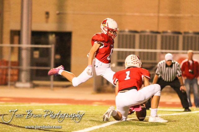 Hoisington Cardinal Tyler Specht (#1) holds the ball as Inigo Barrena Carpio (#8) kicks a Point After Touchdown. The Hoisington Cardinals defeated the Lyons Lions to win the KSHSAA Class 3A District 15 Championship at Elton Brown Field in Hoisington, Kansas on October 27, 2016. (Photo: Joey Bahr, www.joeybahr.com)undefined