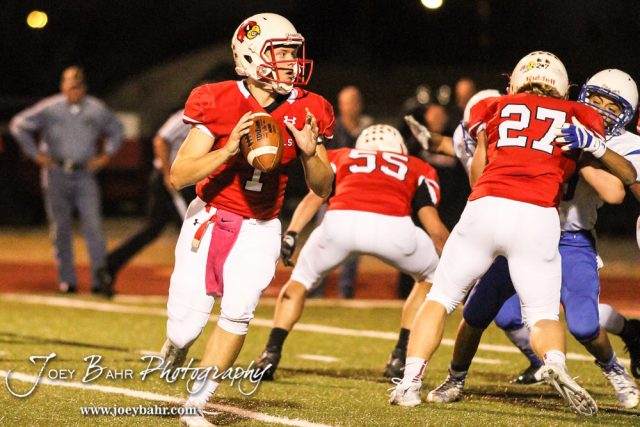Hoisington Cardinal Tyler Specht (#1) rolls out looking for a receiver to throws a pass to. The Hoisington Cardinals defeated the Lyons Lions to win the KSHSAA Class 3A District 15 Championship at Elton Brown Field in Hoisington, Kansas on October 27, 2016. (Photo: Joey Bahr, www.joeybahr.com)undefined