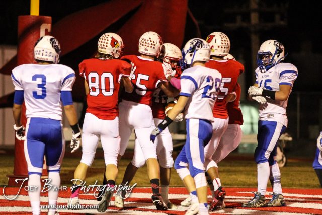 Teammates congratulate Hoisington Cardinal Jake Curtis (#42) on scoring a touchdown. The Hoisington Cardinals defeated the Lyons Lions to win the KSHSAA Class 3A District 15 Championship at Elton Brown Field in Hoisington, Kansas on October 27, 2016. (Photo: Joey Bahr, www.joeybahr.com)undefined