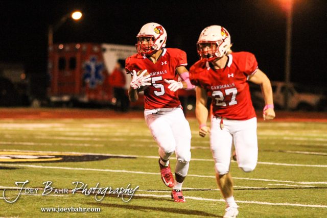 Hoisington Cardinal Hunter Hanzlick (#27) lead blocks for Cameron Davis (#5). The Hoisington Cardinals defeated the Lyons Lions to win the KSHSAA Class 3A District 15 Championship at Elton Brown Field in Hoisington, Kansas on October 27, 2016. (Photo: Joey Bahr, www.joeybahr.com)undefined