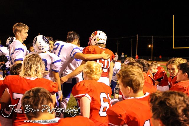 Lyons Lions console Hoisington Cardinal Jeremy Breit (#60) on the loss of his father this week. The Hoisington Cardinals defeated the Lyons Lions to win the KSHSAA Class 3A District 15 Championship at Elton Brown Field in Hoisington, Kansas on October 27, 2016. (Photo: Joey Bahr, www.joeybahr.com)undefined