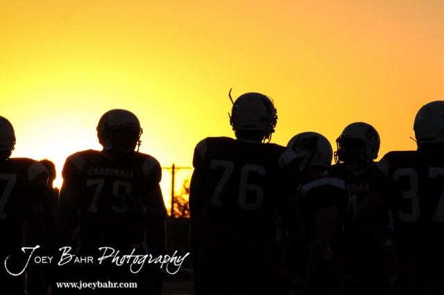 The Hoisington Cardinals warmup prior to the Hoisington Cardinals versus Lyons Lions High School Football game with Hoisington winning 54 to 13 at Elton Brown Field at Hoisington High School in Hoisington, Kansas on October 30, 2014. (Photo: Joey Bahr, www.joeybahr.com)