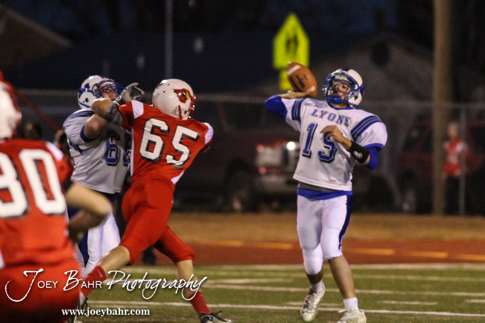 Lyons Lion Tyler Edwards (#15) throws a pass during the Hoisington Cardinals versus Lyons Lions High School Football game with Hoisington winning 54 to 13 at Elton Brown Field at Hoisington High School in Hoisington, Kansas on October 30, 2014. (Photo: Joey Bahr, www.joeybahr.com)