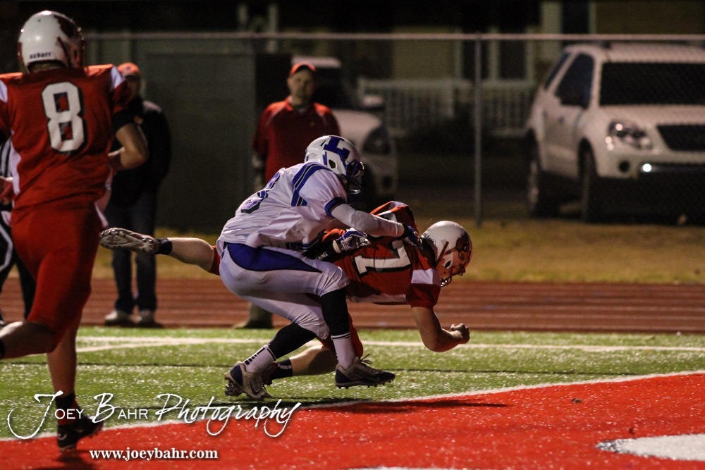 Hoisington Cardinal Hunter Hanzlick (#27) dives for the end zone during the Hoisington Cardinals versus Lyons Lions High School Football game with Hoisington winning 54 to 13 at Elton Brown Field at Hoisington High School in Hoisington, Kansas on October 30, 2014. (Photo: Joey Bahr, www.joeybahr.com)