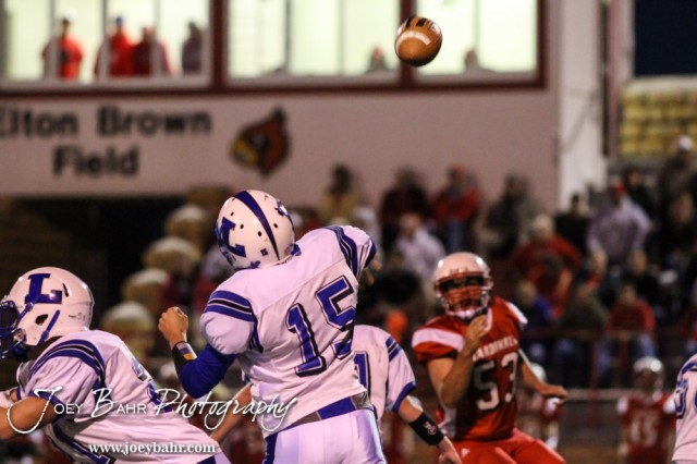 Lyons Lion Tyler Edwards (#15) throws a pass during the Hoisington Cardinals versus Lyons Lions High School Football game with Hoisington winning 54 to 13 at Elton Brown Field at Hoisington High School in Hoisington, Kansas on October 30, 2014. (Photo: Joey Bahr, www.joeybahr.com)