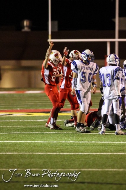 The Hoisington Cardinals signal that they recovered a fumble during the Hoisington Cardinals versus Lyons Lions High School Football game with Hoisington winning 54 to 13 at Elton Brown Field at Hoisington High School in Hoisington, Kansas on October 30, 2014. (Photo: Joey Bahr, www.joeybahr.com)