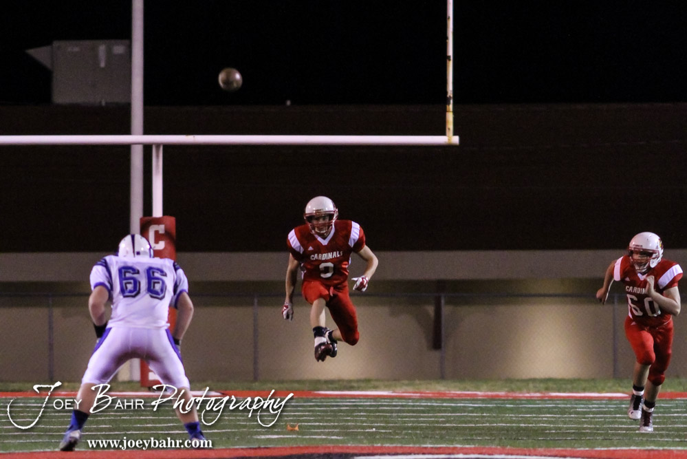 Hoisington Cardinal Brandon Ball (#9) kicks the ball off during the Hoisington Cardinals versus Lyons Lions High School Football game with Hoisington winning 54 to 13 at Elton Brown Field at Hoisington High School in Hoisington, Kansas on October 30, 2014. (Photo: Joey Bahr, www.joeybahr.com)