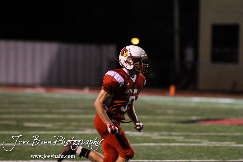 Hoisington Cardinal Brandon Ball (#9) runs a pass route during the Hoisington Cardinals versus Lyons Lions High School Football game with Hoisington winning 54 to 13 at Elton Brown Field at Hoisington High School in Hoisington, Kansas on October 30, 2014. (Photo: Joey Bahr, www.joeybahr.com)