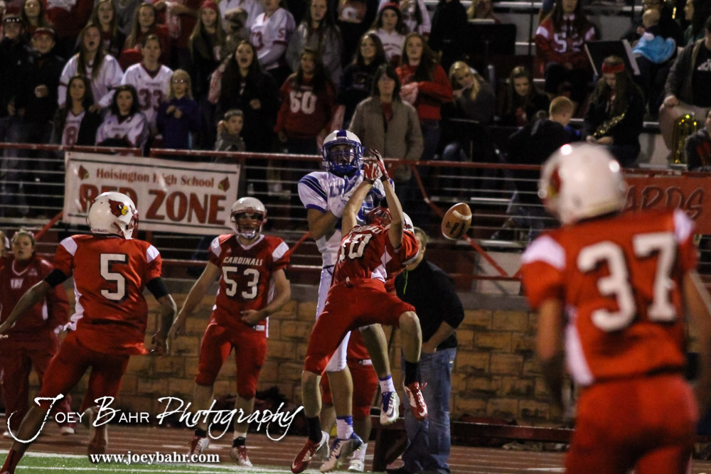 Hoisington Cardinal Kody Lang (#10) breaks up a pass for Lyons Lion Grady Kirkhart (#85) during the Hoisington Cardinals versus Lyons Lions High School Football game with Hoisington winning 54 to 13 at Elton Brown Field at Hoisington High School in Hoisington, Kansas on October 30, 2014. (Photo: Joey Bahr, www.joeybahr.com)