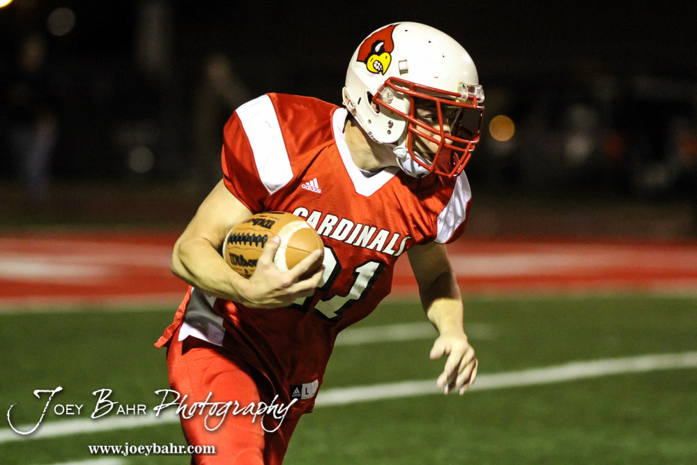 Hoisington Cardinal Rudy Gearhart (#21) carries the ball during the Hoisington Cardinals versus Lyons Lions High School Football game with Hoisington winning 54 to 13 at Elton Brown Field at Hoisington High School in Hoisington, Kansas on October 30, 2014. (Photo: Joey Bahr, www.joeybahr.com)