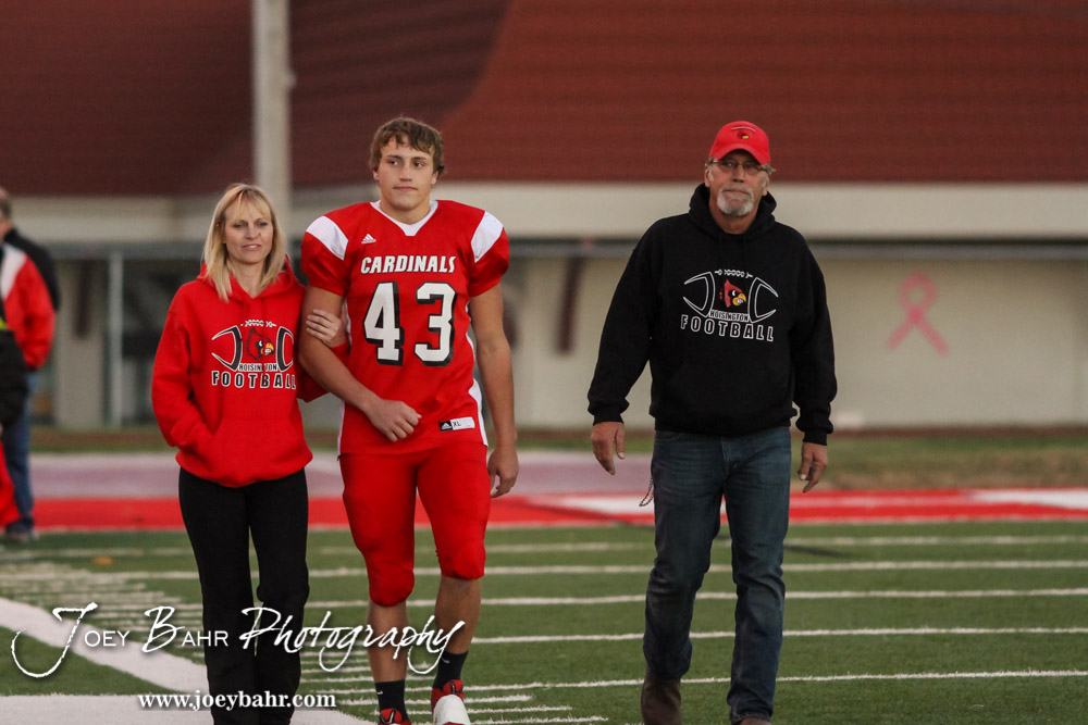 during the Hoisington Cardinals versus Lyons Lions High School Football game with Hoisington winning 54 to 13 at Elton Brown Field at Hoisington High School in Hoisington, Kansas on October 30, 2014. (Photo: Joey Bahr, www.joeybahr.com)