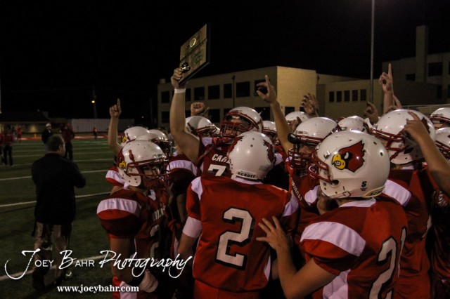 The Hoisington Cardinals hold up the District 15 Champions Trophy after the Hoisington Cardinals versus Lyons Lions High School Football game with Hoisington winning 54 to 13 at Elton Brown Field at Hoisington High School in Hoisington, Kansas on October 30, 2014. (Photo: Joey Bahr, www.joeybahr.com)