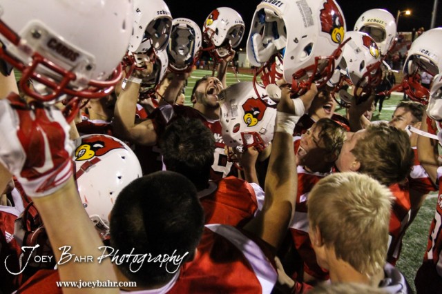 Hoisington Cardinal Seth Owen (#79) leads a cheer following the Hoisington Cardinals versus Lyons Lions High School Football game with Hoisington winning 54 to 13 at Elton Brown Field at Hoisington High School in Hoisington, Kansas on October 30, 2014. (Photo: Joey Bahr, www.joeybahr.com)