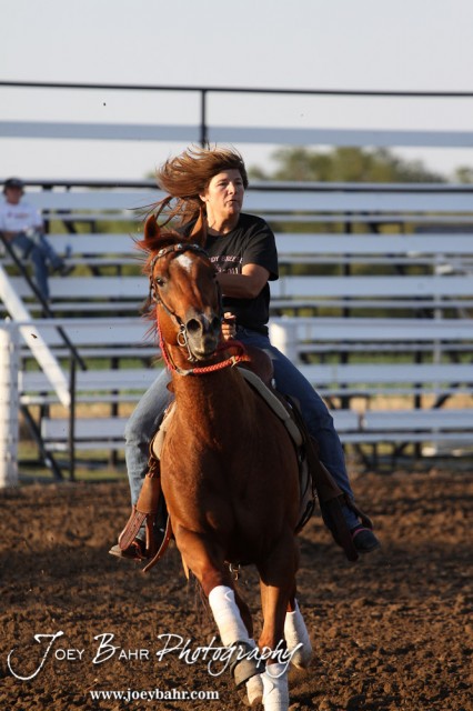 A barrel racer performs during the National Barrel Horse Association Kansas District 4 Race at the 26th Annual McCracken Rodeo at Jack Wilson Mustang Arena in McCracken, Kansas on July 11, 2012. (Photo: Joey Bahr, www.joeybahr.com)