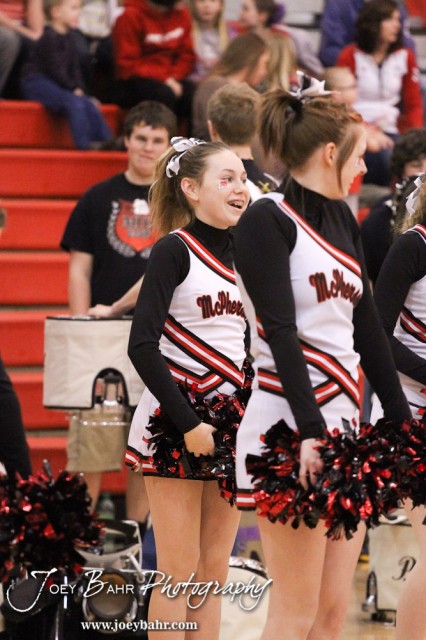 McPherson Bullpup Cheerleaders perform before the Dodge City at McPherson Boys Basketball game with McPherson winning 53 to 42 at The Roundhouse at McPherson High School in McPherson, Kansas on February 1, 2013. (Photo: Joey Bahr, www.joeybahr.com)
