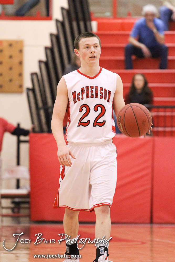 McPherson Bullpup Kyler Kinnamon (#22) walks the ball up the court during the Dodge City at McPherson Boys Basketball game with McPherson winning 53 to 42 at The Roundhouse at McPherson High School in McPherson, Kansas on February 1, 2013. (Photo: Joey Bahr, www.joeybahr.com)