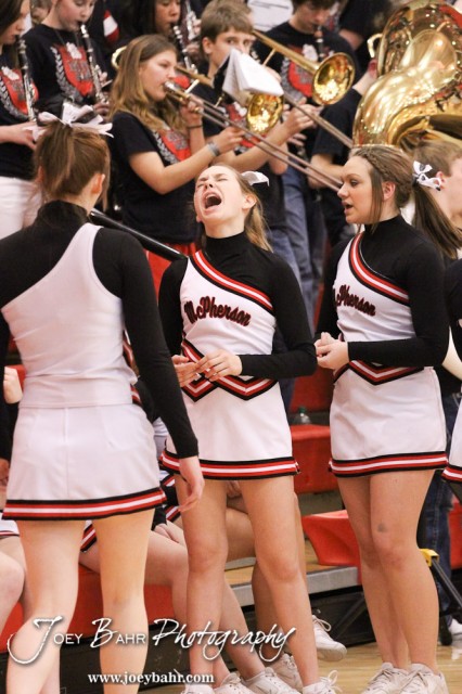 McPherson Bullpup Cheerleader Anna Bahr sings along to a song the band plays during the Dodge City at McPherson Boys Basketball game with McPherson winning 53 to 42 at The Roundhouse at McPherson High School in McPherson, Kansas on February 1, 2013. (Photo: Joey Bahr, www.joeybahr.com)