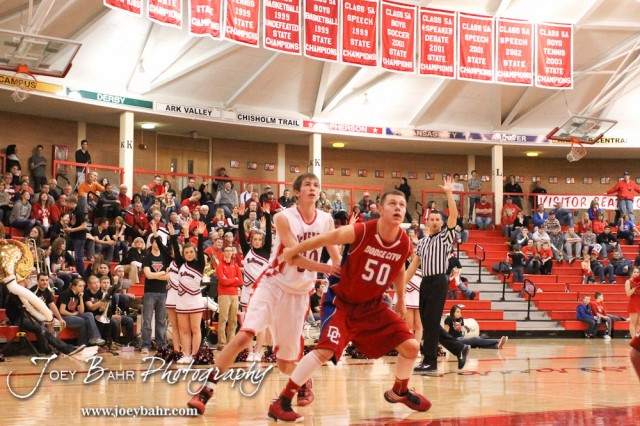 McPherson Bullpup Peter Horton (#30) and Dodge City Demon Matt Goedeken (#50) jockey for position to rebound a free throw attempt during the Dodge City at McPherson Boys Basketball game with McPherson winning 53 to 42 at The Roundhouse at McPherson High School in McPherson, Kansas on February 1, 2013. (Photo: Joey Bahr, www.joeybahr.com)