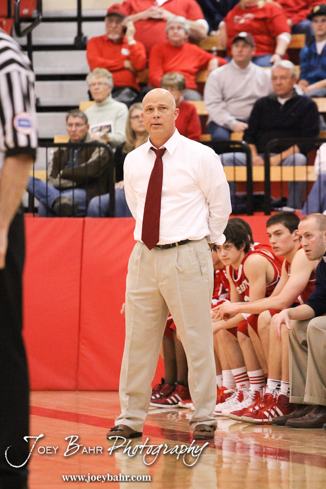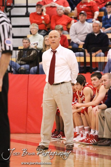 Dodge City Demon Head Coach Dennis Hamilton contemplates his next call during the Dodge City at McPherson Boys Basketball game with McPherson winning 53 to 42 at The Roundhouse at McPherson High School in McPherson, Kansas on February 1, 2013. (Photo: Joey Bahr, www.joeybahr.com)