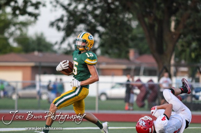 Salina South Cougar Dylan Becker (#15) scores a touchdown during the McPherson Bullpups versus Salina South Cougars High School Football gamme with Salina South winning 61 to 32 at Salina Stadium in Salina, Kansas on September 4, 2014. (Photo: Joey Bahr, www.joeybahr.com)