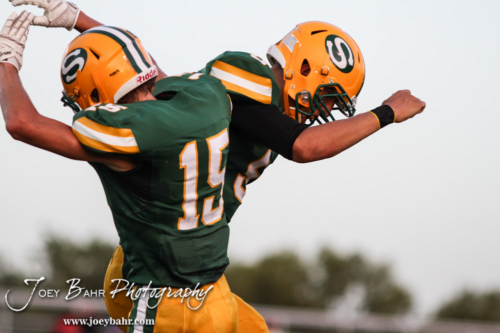 Salina South Cougar Dalton Wassenberg (#5) celebrates scoring a touchdown with Dylan Becker (#15) during the McPherson Bullpups versus Salina South Cougars High School Football gamme with Salina South winning 61 to 32 at Salina Stadium in Salina, Kansas on September 4, 2014. (Photo: Joey Bahr, www.joeybahr.com)