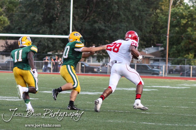 Salina South Cougar Fernando Avila-Castro (#40) pulls on the jersey of McPherson Bullpup Ty Hart (#28) during the McPherson Bullpups versus Salina South Cougars High School Football gamme with Salina South winning 61 to 32 at Salina Stadium in Salina, Kansas on September 4, 2014. (Photo: Joey Bahr, www.joeybahr.com)