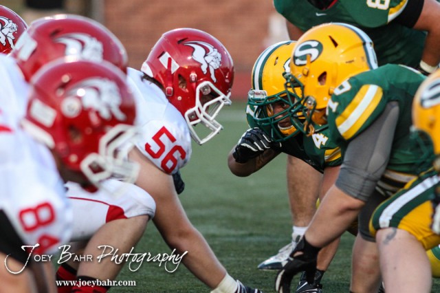 Salina South Cougar Lewis O’thella (#47) stares down McPherson Bullpup Derek Hall (#56) during the McPherson Bullpups versus Salina South Cougars High School Football gamme with Salina South winning 61 to 32 at Salina Stadium in Salina, Kansas on September 4, 2014. (Photo: Joey Bahr, www.joeybahr.com)