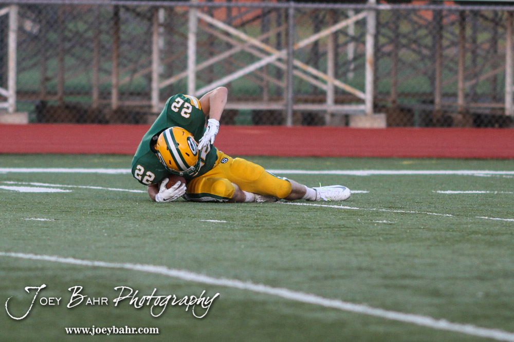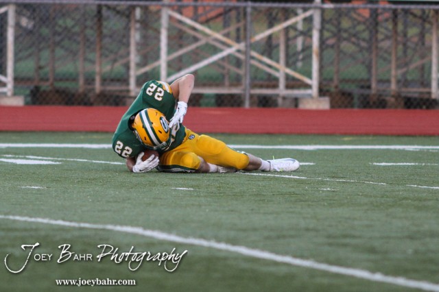 Salina South Cougar Cole Calvert (#22) slaps the turf after intercepting the ball during the McPherson Bullpups versus Salina South Cougars High School Football gamme with Salina South winning 61 to 32 at Salina Stadium in Salina, Kansas on September 4, 2014. (Photo: Joey Bahr, www.joeybahr.com)