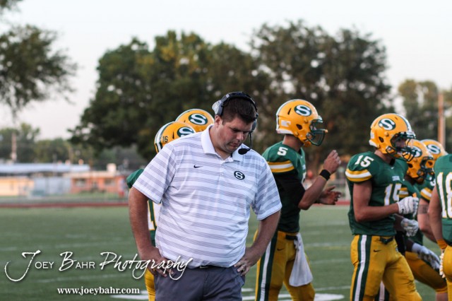 Salina South Cougar Head Coach Sam Sellers talks to his Assistants during the McPherson Bullpups versus Salina South Cougars High School Football gamme with Salina South winning 61 to 32 at Salina Stadium in Salina, Kansas on September 4, 2014. (Photo: Joey Bahr, www.joeybahr.com)
