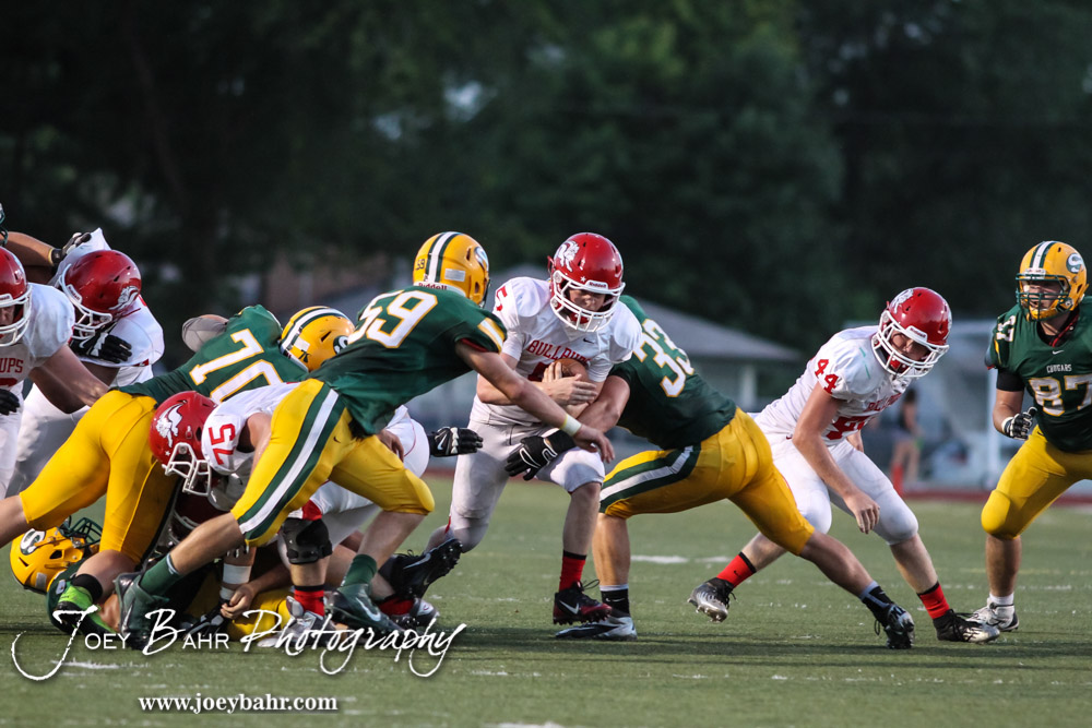 McPherson Bullpup Kyler Kinnamon (#5) rushes with the ball during the McPherson Bullpups versus Salina South Cougars High School Football gamme with Salina South winning 61 to 32 at Salina Stadium in Salina, Kansas on September 4, 2014. (Photo: Joey Bahr, www.joeybahr.com)