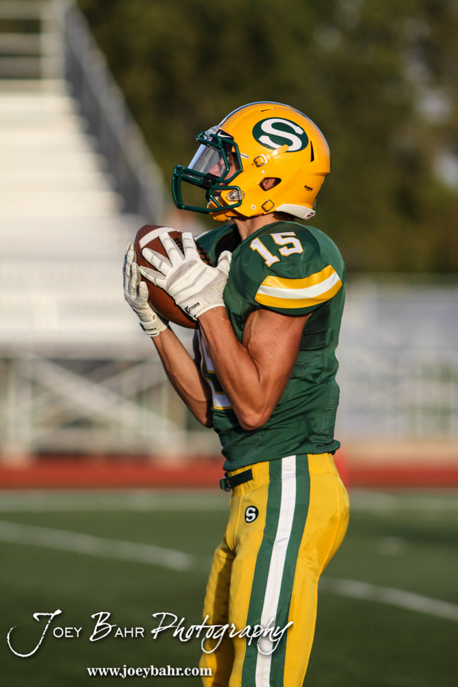 Salina South Cougar Dylan Becker (#15) receives a kickoff during the McPherson Bullpups versus Salina South Cougars High School Football gamme with Salina South winning 61 to 32 at Salina Stadium in Salina, Kansas on September 4, 2014. (Photo: Joey Bahr, www.joeybahr.com)