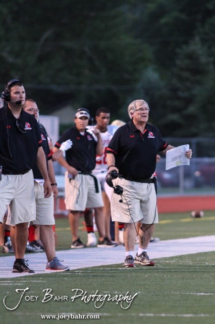 McPherson Bullpup Head Coach Tom Young reacts to a play during the McPherson Bullpups versus Salina South Cougars High School Football gamme with Salina South winning 61 to 32 at Salina Stadium in Salina, Kansas on September 4, 2014. (Photo: Joey Bahr, www.joeybahr.com)
