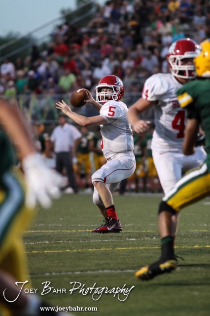 McPherson Bullpup Kyler Kinnamon (#5) passes the ball during the McPherson Bullpups versus Salina South Cougars High School Football gamme with Salina South winning 61 to 32 at Salina Stadium in Salina, Kansas on September 4, 2014. (Photo: Joey Bahr, www.joeybahr.com)
