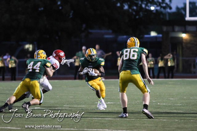 Salina South Cougar Eric Mccullough (#2) rushes with the ball during the McPherson Bullpups versus Salina South Cougars High School Football gamme with Salina South winning 61 to 32 at Salina Stadium in Salina, Kansas on September 4, 2014. (Photo: Joey Bahr, www.joeybahr.com)