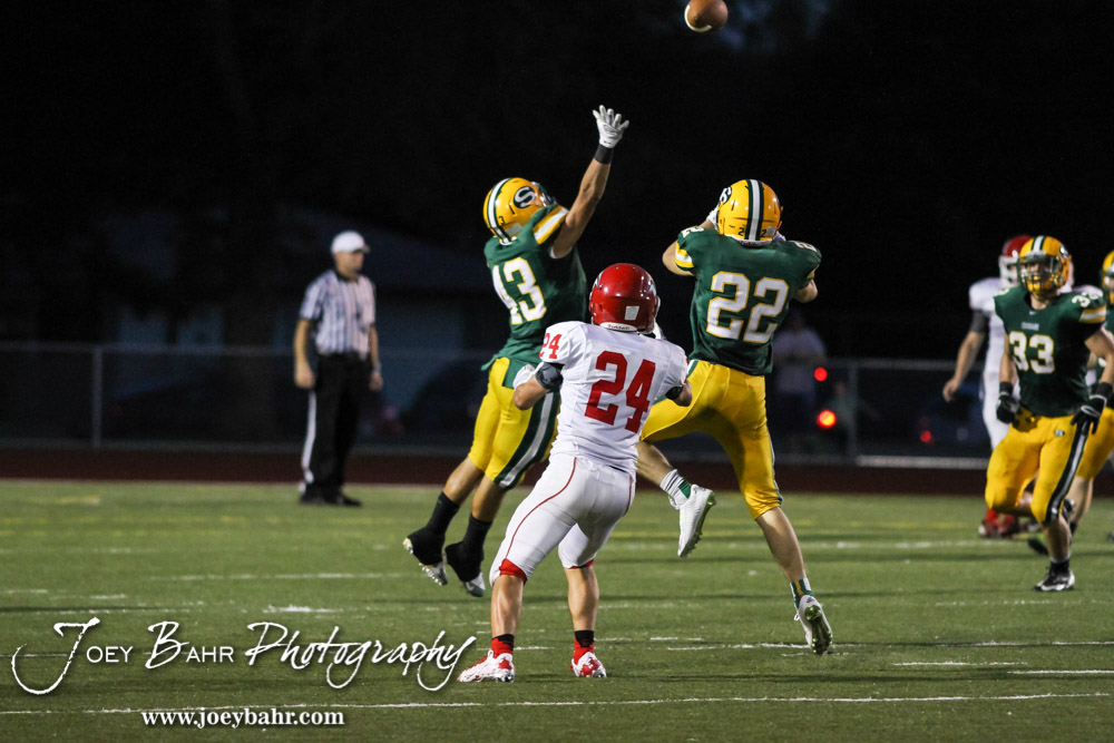 Salina South Cougars Dustin Lauffer (#13) and Cole Calvert (#22) jump in front of a pass intended for McPherson Bullpup Casey Cheek (#24) during the McPherson Bullpups versus Salina South Cougars High School Football gamme with Salina South winning 61 to 32 at Salina Stadium in Salina, Kansas on September 4, 2014. (Photo: Joey Bahr, www.joeybahr.com)
